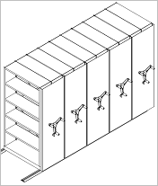 На рисунке 1 мы видим пять отдельных передвижных стеллажей, каждый из которых представляет собой двухстороннюю секцию. Каждый стеллаж оснащен приводом со штурвалом, лицевой стенкой, закрывающей детали привода. Эти узлы составляют значительную долю стоимости мобильного стеллажа.