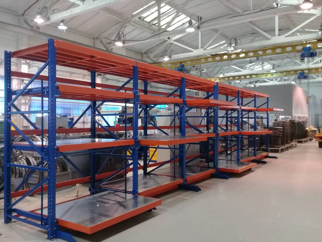 Стеллажи для механического цеха с платформами полного выдвижения и нагрузкой до 1400 кг. Уровни имеют механизм защиты от одновременного выдвижения и фиксацию в выдвинутом и задвинутом состоянии.