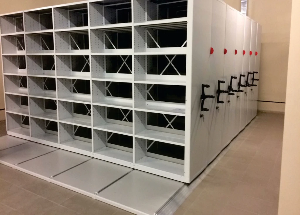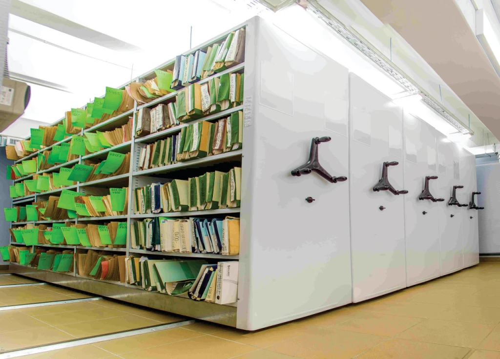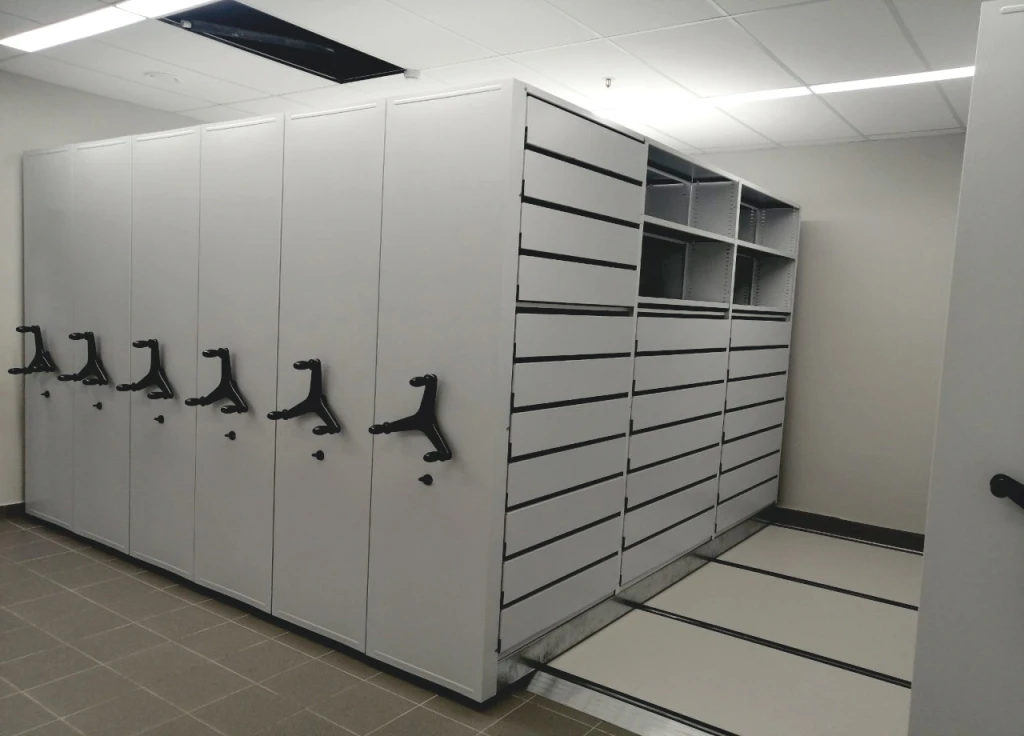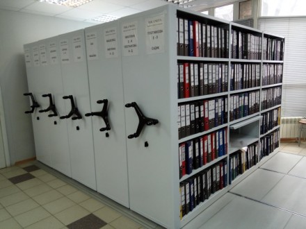 Системы компактного архивного хранения документов. Вдвое повышается вместимость под папки или сокращаются занимаемые площади . Используются двухсторонние передвижные стеллажи для архивохранилища.